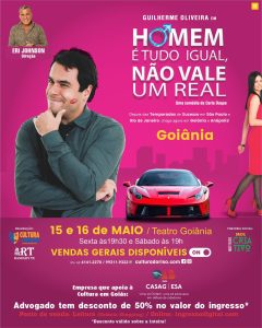 A Caixa de Assistência dos Advogados de Goiás, em parceria com a Cultura do Riso, oferece 50% de desconto para a advocacia no espetáculo “Homem é Tudo Igual, Não Vale Um Real”, estrelado por Guilherme Oliveira. As apresentações serão realizadas nos dias 15 e 16 de maio, às 19h30 e às 19h, respectivamente, no Teatro Goiânia, no Setor Central.