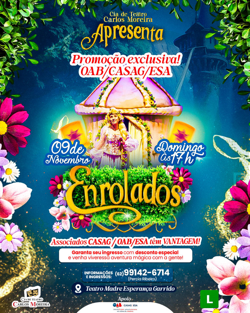 A Caixa de Assistência dos Advogados de Goiás (Casag) e a Cia de Teatro Carlos Moreira garantem à advocacia goiana uma vantagem especial para o espetáculo infantil “Enrolados”, que chega a Goiânia com uma produção encantadora, repleta de música, humor e mensagens de amizade e superação.