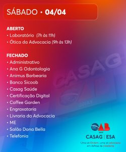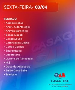 A Caixa de Assistência dos Advogados de Goiás (Casag) informa os horários de funcionamento dos serviços no Centro de Excelência, no período de 3 a 5 de abril, em razão do feriado nacional da Sexta-Feira da Paixão.