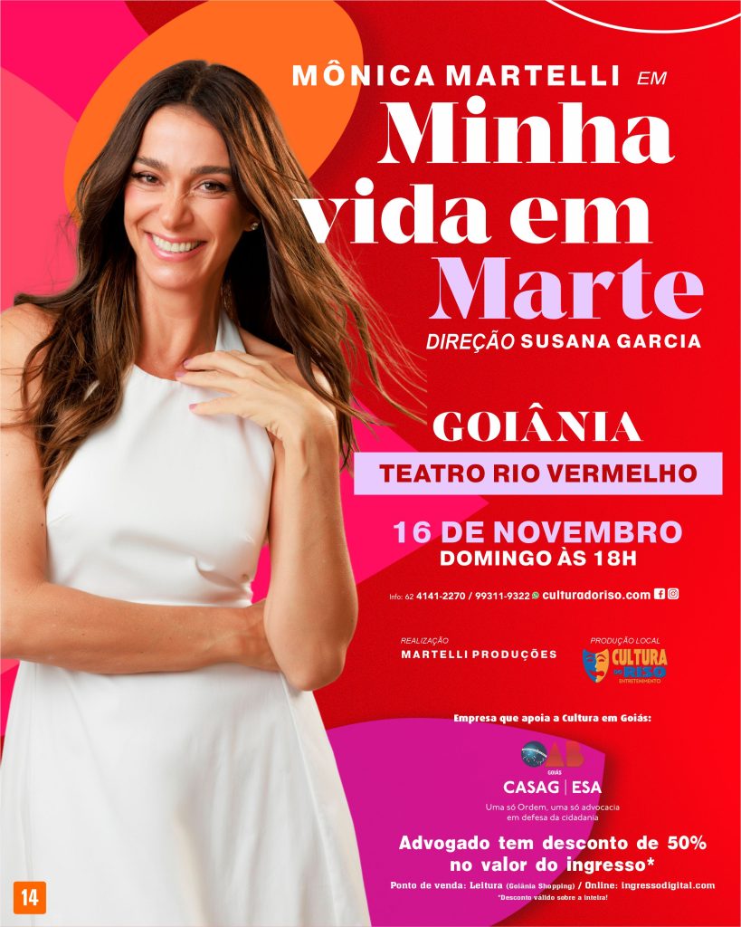 A Caixa de Assistência dos Advogados de Goiás (Casag), em colaboração com a Cultura do Riso, oferece aos advogados e advogadas goianos 50% de desconto no espetéculo “Minha Vida em Marte”, estrelado por Mônica Martelli. A apresentação está marcada para o dia 16 de novembro, às 18h, no Teatro Rio Vermelho.