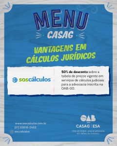 A Caixa de Assistência dos Advogados de Goiás (Casag) firmou parceria com a SOS Cálculos, referência em soluções para cálculos judiciais, que garante 50% de desconto sobre a tabela vigente para advogados, advogadas e estagiários inscritos na OAB-GO, além de atendimento técnico especializado. A iniciativa reforça o compromisso da Casag em oferecer benefícios que promovem mais produtividade e segurança jurídica à classe.